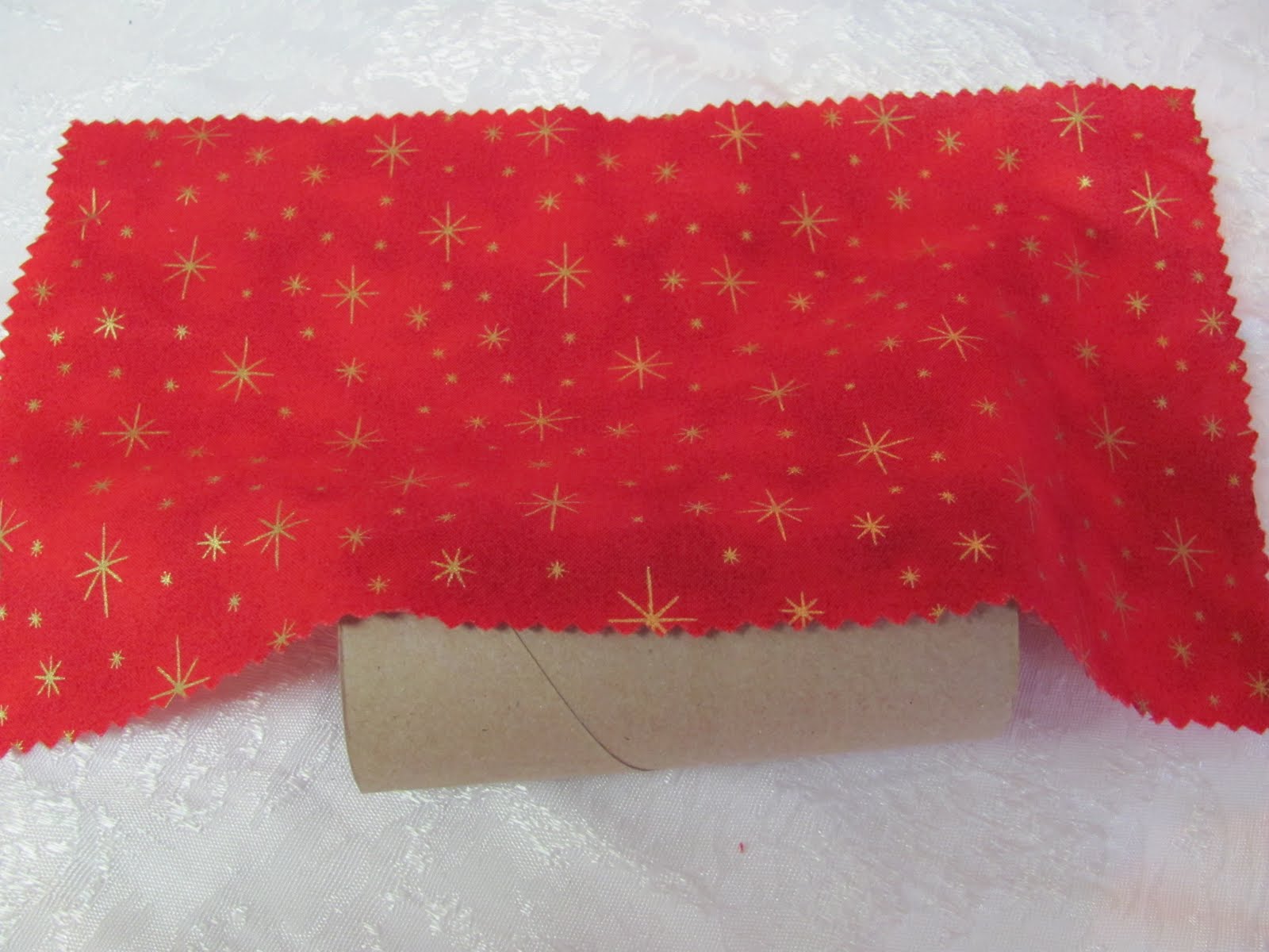 Roll the fabric around your tube and run another bead of glue on the tube and press the fabric into the glue so your tube is now completely wrapped in your Christmas fabric.